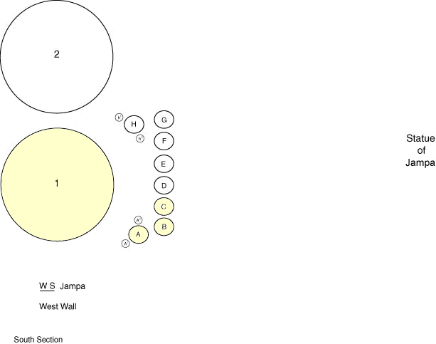 Jampa Gompa > Wall Layouts > Main Floor > West Wall South Section The long dimensions of each mandala is approximately two meters.