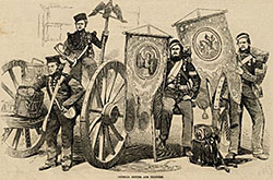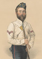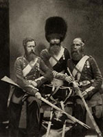 The carte-de-visite photographer even made his way to the battlefield, posing the soldier against a backdrop of tents or a cannon. The carte played an important part in soothing the pain of separation from home, for a soldier could send cartes home to his family to reassure them of his safety. The carte-de-visite was a significant development in military portraiture, for officers as well as enlisted soldiers sat for them and, of course, a soldier of the ranks could be photographed in a setting similar to that used for an officer. Soldiers all posed similarly for their cartes, usually standing with one arm resting on a prop and the other holding a rifle, the only variation being in the backdrops. In this manner photography, specifically the carte-de-visite, truly democratized military portraiture. The photographic portrait was popular with the middle class because it captured the likeness of the sitter rapidly and inexpensively, and thus rivaled painted portraits and painting in general as a serious art. Yet the informality of the carte-de-visite was a major deterrent to continued enthusiasm. By the mid-1860s its popularity had begun to subside because of its mass production and resulting decreased quality, and because of the inevitable boredom with its format. The cabinet card photograph, first introduced in England in 1866, replaced the carte in popularity. It was larger (16.4 x 11 cm.) and more formal in appearance, recalling the portraits that existed before the era of photography. In an era of continued concern for the soldier, military portraiture now moved toward realistic and even graphic representations of the war veteran made possible by the direct nature of photography. Never before had soldiers been depicted in a way that demonstrated so specifically the grim realities of war. Wounded veterans returning from the Crimea were visited in hospitals by Queen Victoria. The photographs of these veterans, accurate and realistic depictions of the effects of war are considered by many to be the beginning of documentary photography.