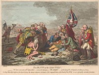 Gillray parodies Benjamin West's painting The Death of General Wolfe in this satire of the passing of the Treason and Sedition Bills December 18th, 1795 by the Pitt ministry. These bills prohibited gatherings of more than fifty people without advance notification to a magistrate, and penalized anyone who wrote or spoke against the Constitution. Gillray replaces Wolfe with Pitt, the "Great WOLF," who is dying, ironically, at the moment of his political victory. He has formed a coalition government, and with these bills has succeeded in quelling any opposition to the war with France. Gillray may have depicted Pitt as dying to imply that the passing of these bills, which severely restricted freedom of speech, might cause Pitt's political ruin.