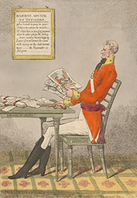Green was accused in 1811 of misappropriating funds from the army paymaster in order to settle his own accounts. A framed motto on the wall behind him attests to his predilection for unilateral loans: "Dashing Advice to Officers.. .If your friend leaves the room with money on the table borrow some – the Paymaster is fair game. –" Green was never indicted for his actions, but in the same year he was transferred from the 87th Foot to the 34th, possibly in an attempt to quash suspicions of dishonorable behavior. On his buttons and sword belt is inscribed the number 34, indicating his recent transfer. His actions occasioned numerous prints satirizing his greed and corruption.