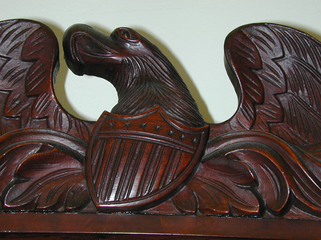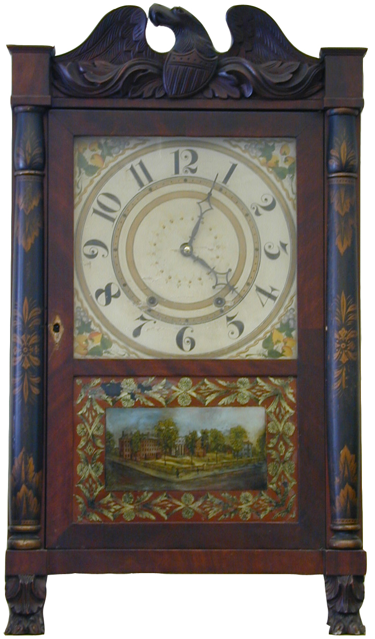 Made with solid wood and veneers, this Seth Thomas shelf clock with an eagle-shaped pediment contains a 31-day movement with hour and half-hour strike. The "scroll dial, painted with white and gold Arabic numerals that are rotated in space according to their directions, as opposed to the usual straight and upright posture. Smaller rings mark the minute gradations and colorful vines and fruits fill the four corners. The works are concealed behind a reverse glass painting depicting Brown University from Waterman and Prospect Streets. The flanking pilasters are painted black with bronze stenciled decoration on hairy paw feet in the front.