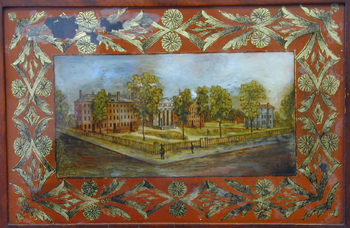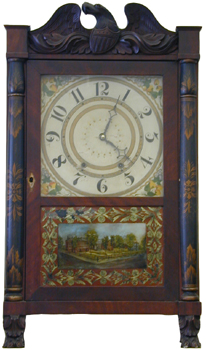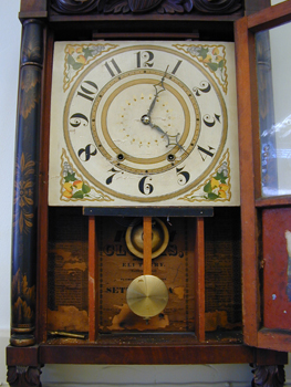 Provenance: No donor's plaque visible. Clockmaker biography: Seth Thomas, born on August 18, 1785 in Greystone, Plymouth, Conn. son of James and Martha Thomas, died January 29, 1859. He had learnt cabinet making in ca. 1818 and was licensed to manufacture some 4,000 clocks for Eli Terry, whose sons were still too young to enter the business then (1817 to 1823). Terry and Thomas were joined by Silas Hoadley and they made wooden 30-hour movements, tall clock cases, and was called Terry, Thomas & Hoadley. After Terry sold his share in 1809, Thomas & Hoadley continued successfully until 1813, when Thomas sold his interest and moved to Plymouth Hollow where he started Seth Thomas Clock Co., which employed more the 900 people in 1853. Seth Thomas eventually adapted the design to his advantage with an off-center pendulum which differed significantly with the patent. [1] Plymouth Hollow was named "Thomaston" in 1866 in his honor. [2] The Pillar and Scroll clocks using wooden movement were successful until 1838, when the 30-hour brass movement was adopted. By ca. 1850, almost all clock weights had been replaced by springs. References: [1] Zea, Philip and Cheney, Robert. Clock Making in New England 1725-1825. Old Sturbridge Inc. 1992, p. 127. [2] Palmer, Brooks. The Book of American Clocks. The Macmillan Company. New York, 1959. | |||||||||||||||||||||