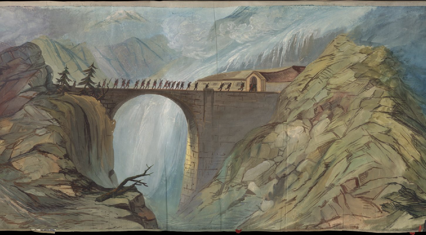 In the Pass of the Cardinells, Garibaldi and his volunteers travel on a treacherous path overhanging gulches with depths of nearly a thousand feet.