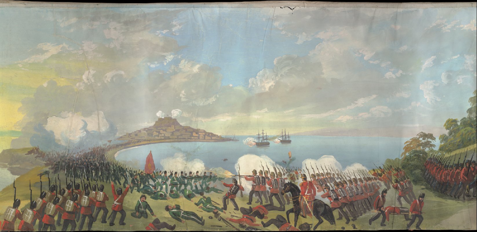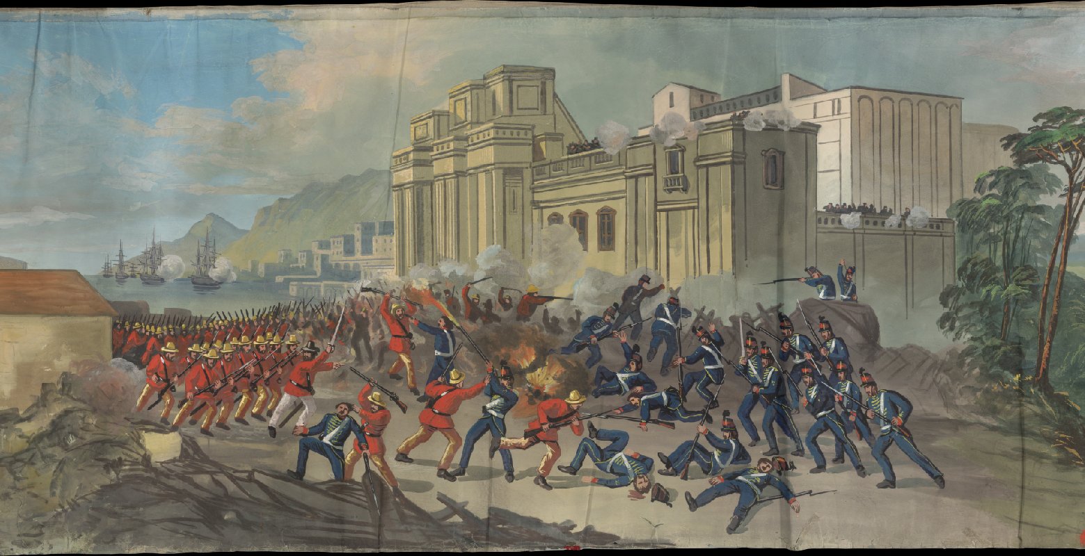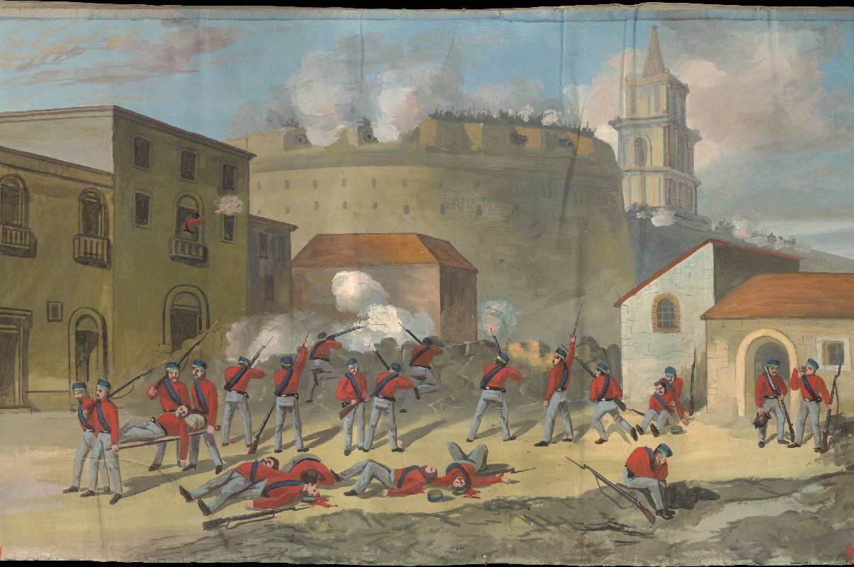 At the Battle of Milazzo, the English battallion, commanded by Lieutenant Colonel Dunne, having gained an advanced post, create a barricade at the top of the narrow strip of land between the mainland and the citadel and maintain fire against the Neapolitans.