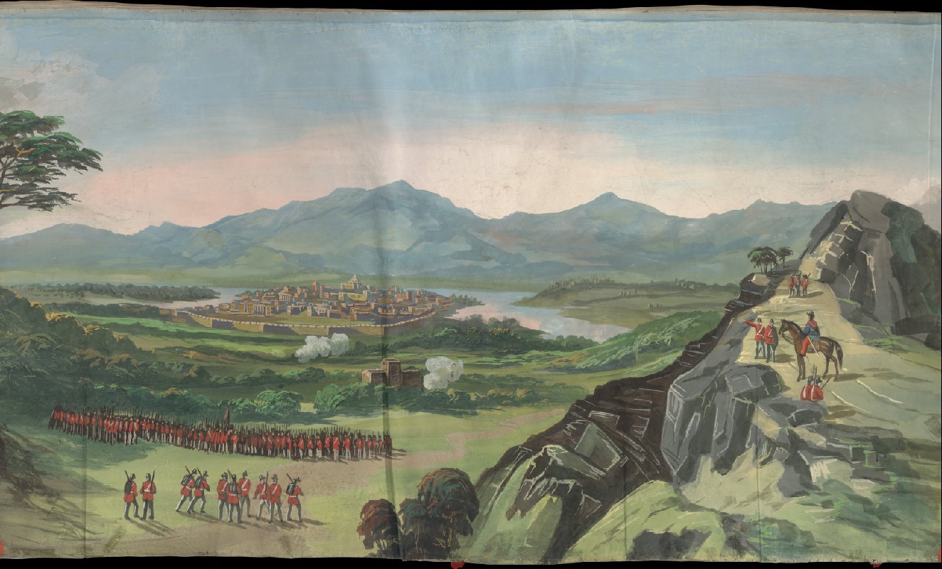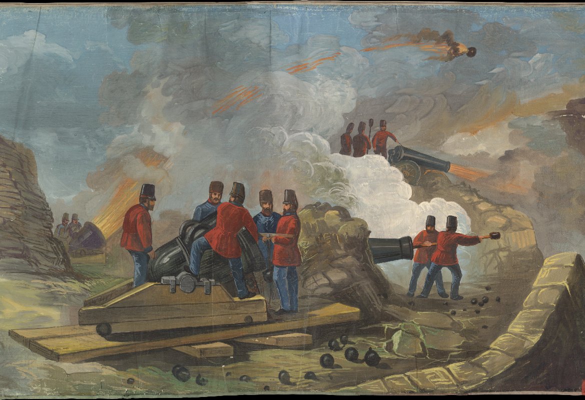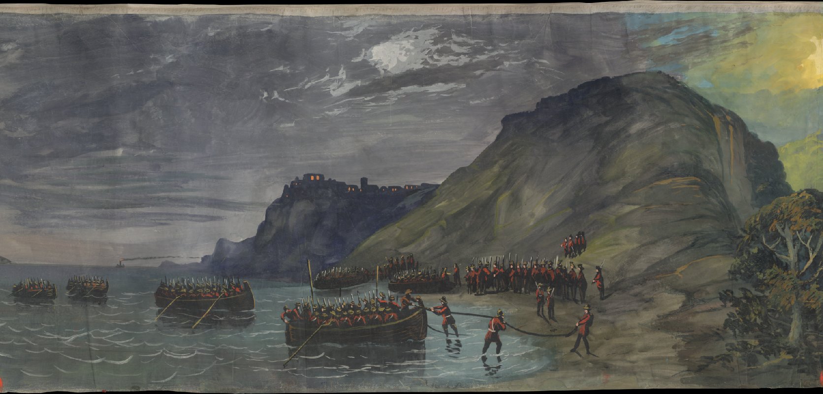 At the Battle of Milazzo, the English battallion, commanded by Lieutenant Colonel Dunne, having gained an advanced post, create a barricade at the top of the narrow strip of land between the mainland and the citadel and maintain fire against the Neapolitans.