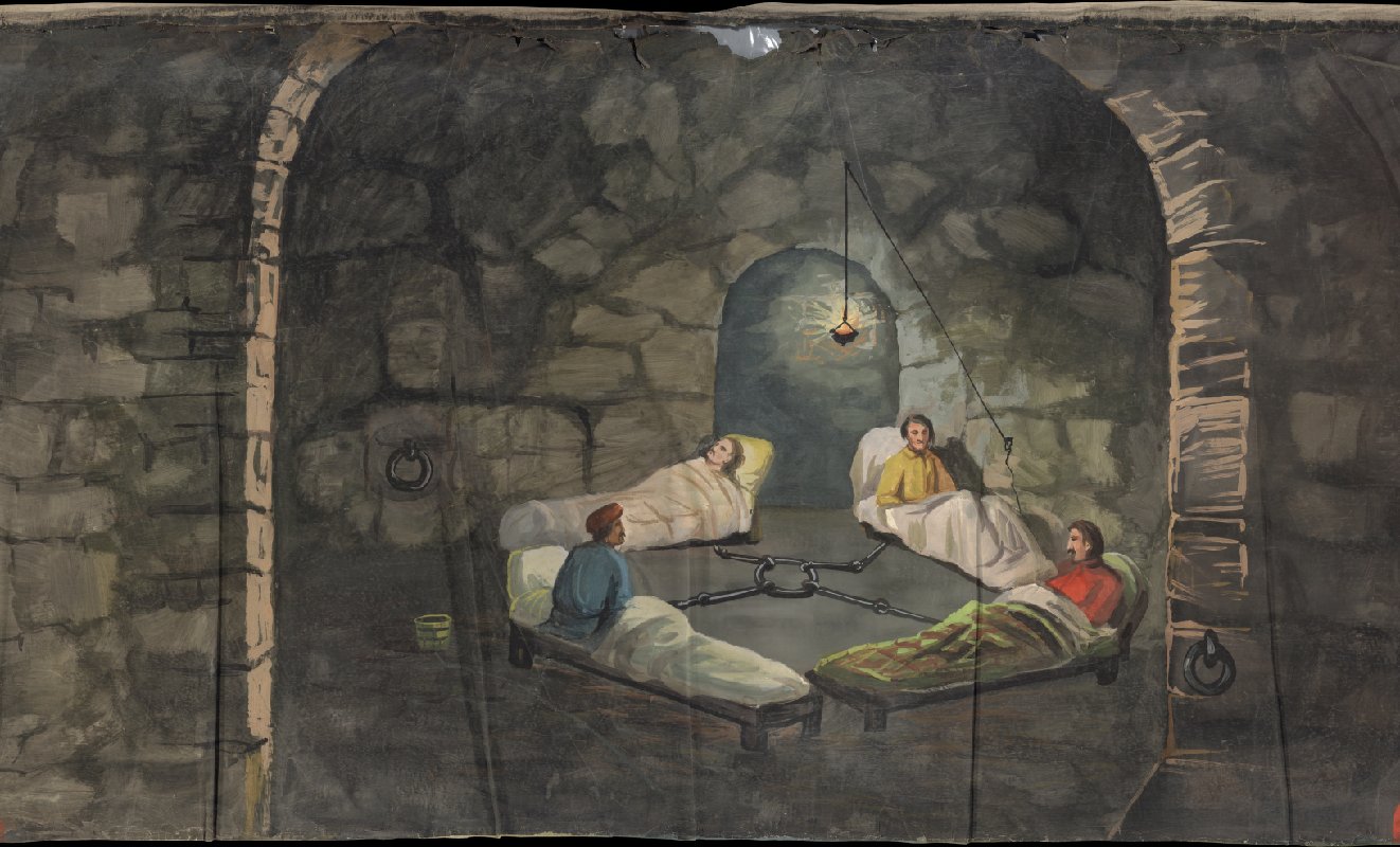A sketch of the prison cell in the Bagno di Ischia in which Baron Poerio and his companions are confined for many years. Poerio is on the left and Piroritis is on the right.