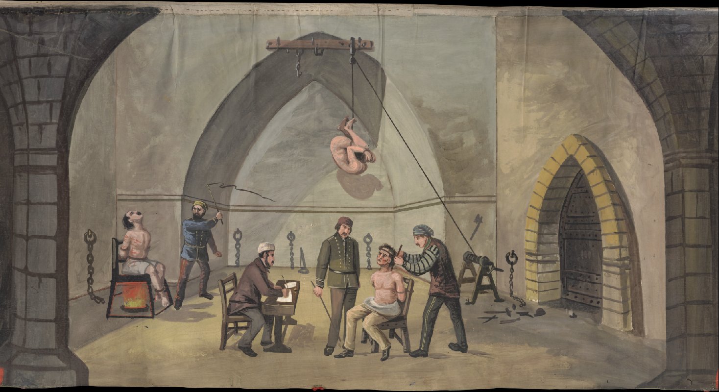 Under the auspices of the director of police of Sicily, torture is being used in the Monreale prison. The famous Pontillo is making his victim sit down on a railed armed chair fit with razor blades under which is set a pan of burning coals. Another commissary uses "the angelic instrument", little iron hands with a closing screw. The third jailer, Bruno, tortures by stripping down his prisoner and hanging him upside down with his head between his knees.