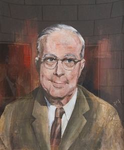 The portrait of George Meehan is one of a group of paintings commissioned to honor the guiding lights of ice hockey at Brown. It can be seen in the Meehan Foyer in Meehan Auditorium, alongside other portraits of Brown's Sports Legends.