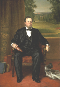 George P. A. Healy was a well-known American portraitist and historical painter from Boston. Healy had studied in Paris and later lived and worked in many cities of Europe and America, residing in Chicago at the time of his death. His reputation as a fine portraitist led to a commission from King Louis Philippe I in France in 1842 for portraits of the American presidents. As the king was overthrown six years later, the fifteen completed works were never delivered and now hang in the Corcoran Gallery of Art in Washington DC. His sitters include Abraham Lincoln, Andrew Jackson, Pope Pius IX, and Louisa May Alcott. The University commissioned Sayles's portrait following the completion of Sayles Hall. An unspotted engraver's mistake caused the brass plaque of both this painting and the one of Sayles's son to read "Request of William Sayles" instead of "Bequest of William Sayles."