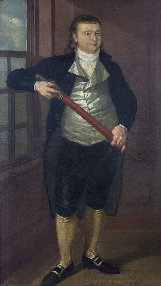 This portrait is said to be the likeness of a "Captain James Brown," and while there were several sea captains of that name in eighteenth-century Providence, this particular Captain James Brown is virtually unknown today. According to the dates provided by the portrait's donor, the James Brown pictured in this painting was born in 1753. If so, he was a fifth generation descendant of Chad Brown, one of Providence, Rhode Island's original settlers and ancestor to Nicholas Brown (BP 2), Brown University's namesake and benefactor. Nicholas's grandfather was the well-known Captain James Brown (1698 - 1739.) Ancestor Chad Brown and his wife Elizabeth had six sons, and the subject of this portrait descended in a different line than the branch of the family associated with Brown University, making him a fourth cousin to the university's Nicholas Brown. The subject is wearing clothing of a style popular in late-eighteenth century Rhode Island (see the portrait of Captain Abraham Whipple, BP 167), which makes it likely that he is indeed the late-eighteenth-century James Brown and not the grandfather of Brown University's benefactor, who died in 1739, or Nicholas's older brother James, who died in 1750. Nicholas Brown had a nephew James, situated in the late eighteenth century, but he was not a sea captain.