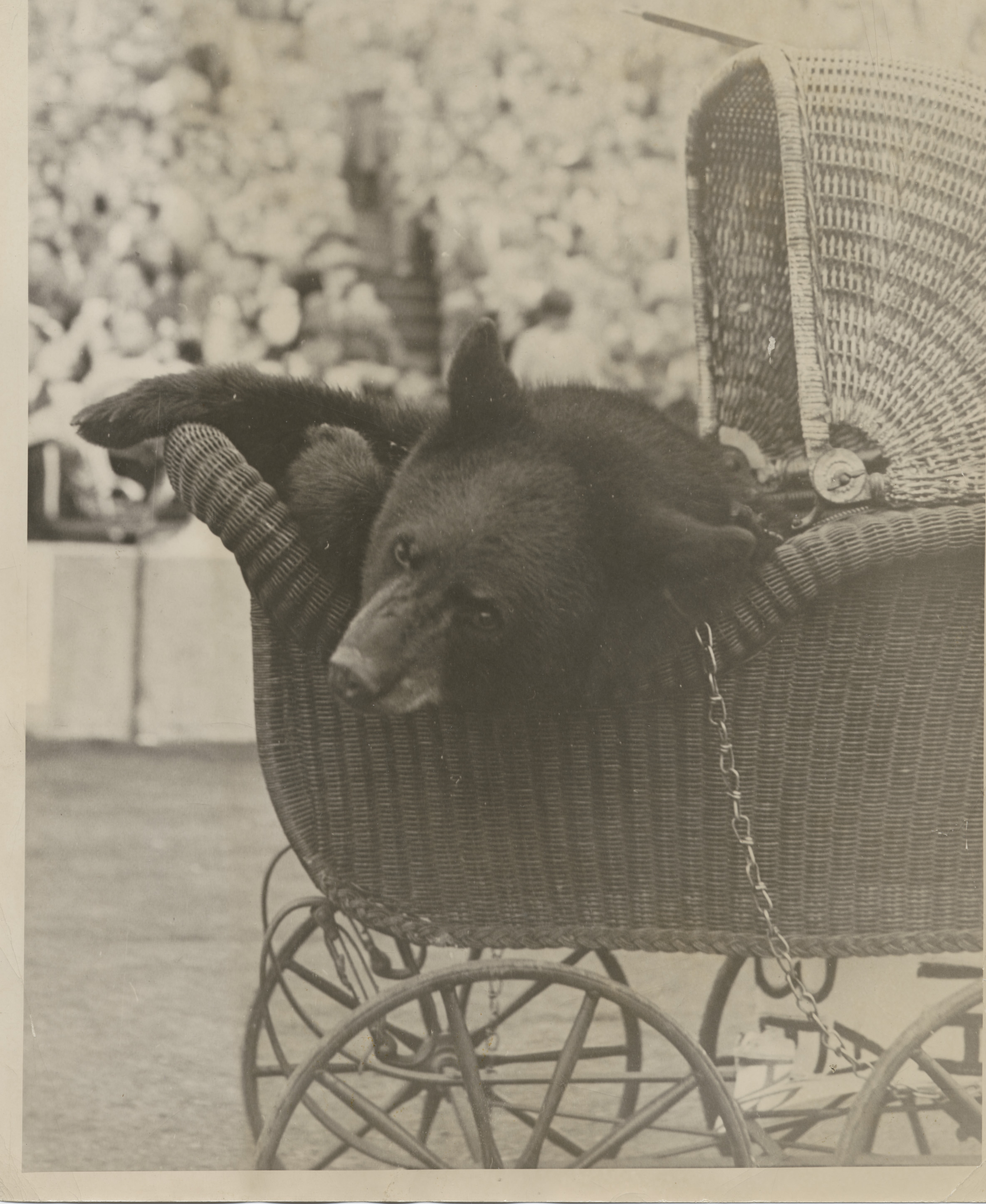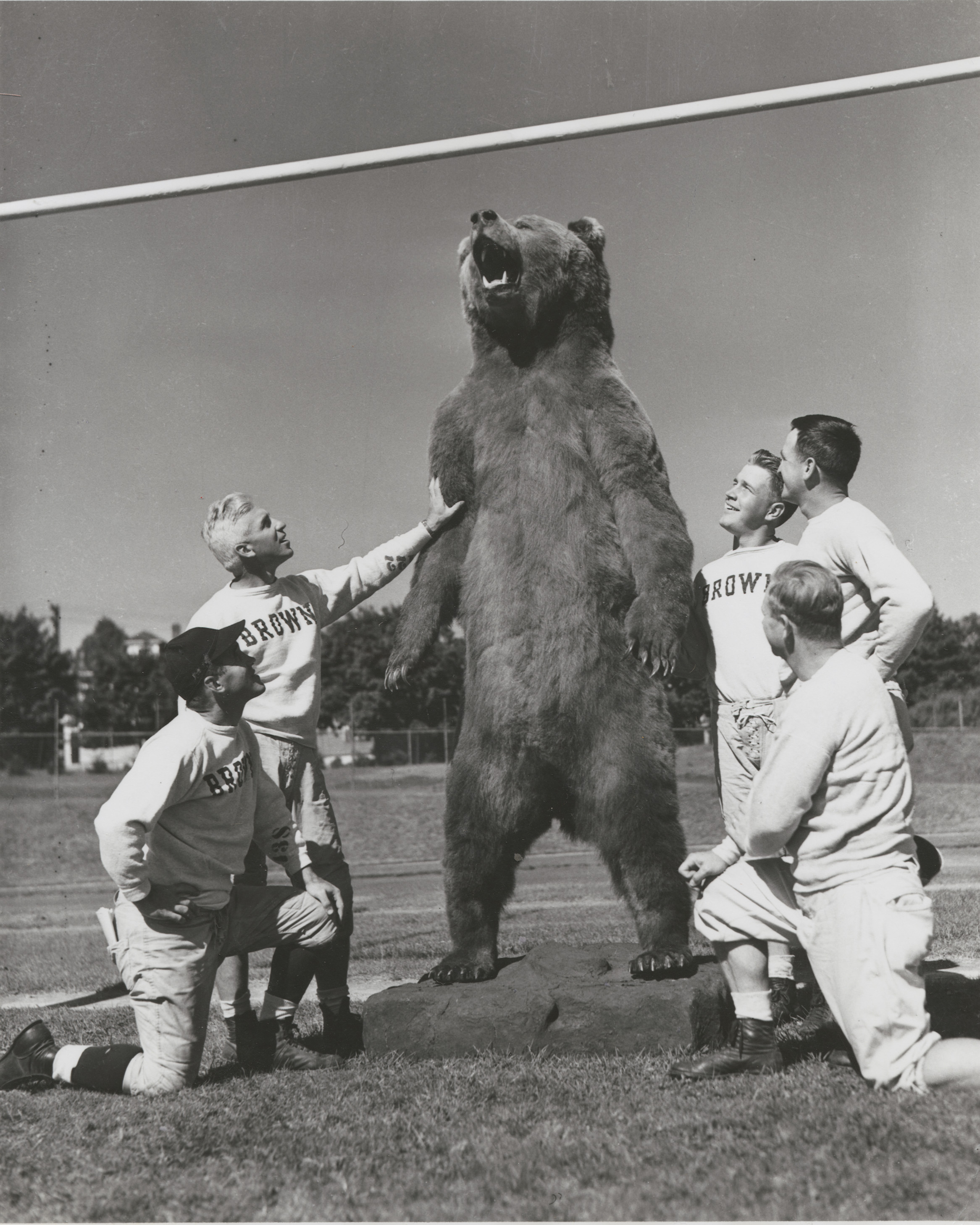Live bear activity returned in 1947. A special one page September 27 issue of the Brown Daily Herald announced the arrival of Bruno VIII, an eight month old cub from Egypt, MA. A collection was taken at the huge rally for the bear’s upkeep. Bruno IX, another Chase Farm bear, arrived on campus in June, 1948. This Bruno attained celebrity status because of his air travels, being the first animal to fly in a plane as a passenger. At Homecoming he is pictured being conveyed in a baby carriage, where he enjoyed his bottle of milk. Bruno IX’s final act was an unforgettable appearance at the Thanksgiving Day game, when he landed at halftime in a helicopter, received citations for his service, drank a milk toast to the crowd, re-entered the aircraft in his crate, and headed for retirement at Roger Williams Zoo, while the crowd sang the Alma Mater. On October 15, 1948 a huge Kodiak Bear was presented to President Wriston by midwestern alumni. “Big Brown’s ” arrival was a national sensation, covered by more than 400 newspapers in 46 states. This original photo taken at Aldrich Field contained the following caption: “OH! FOR A TACKLE LIKE THIS! says Rip Engle, Brown’s football coach, as he and his staff examine Brown’s new big bear, a 9 foot 4 inch Kodiak (stuffed).”
