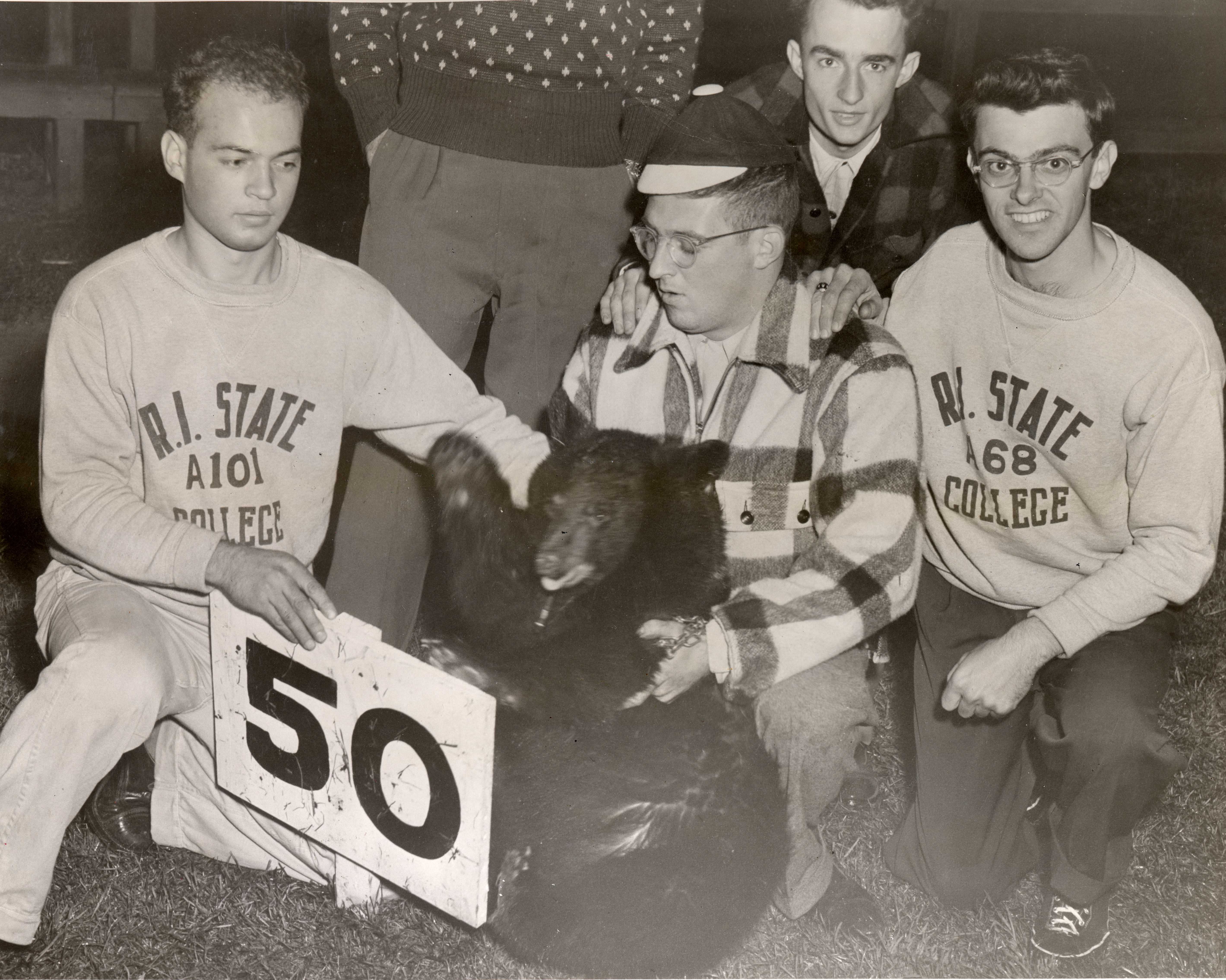 In 1949, Bruno X had the distinction of being the first to occupy the newly-constructed cage under the visitors stands at Brown Field. In spite of the securely locked cage, Rhode Island State students again captured Bruno.