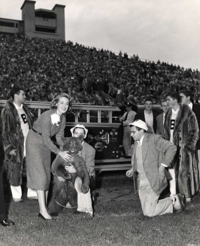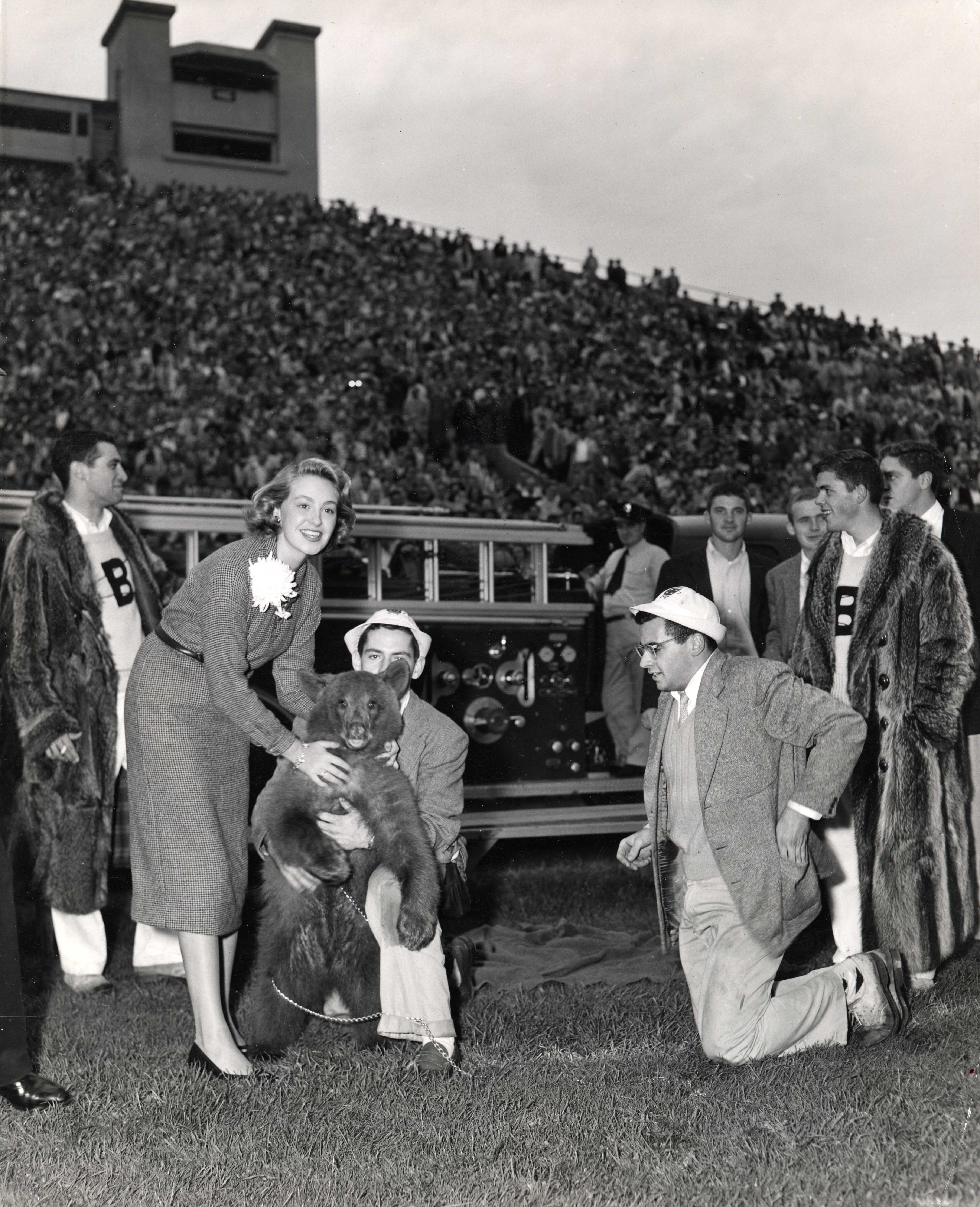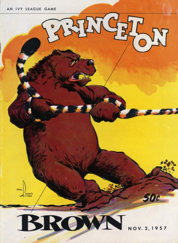 In 1950 Brown had two mascots. The first Bruno XI was the largest cub in history and was quickly replaced by a “smaller, tamer, more docile” version. Two weeks later Bruno XI died at the University of Pennsylvania Vet School, where he had been staying for the weekend. The cause of Bruno’s sudden demise was a pulmonary infection, which perhaps had been exacerbated by the frigid temperature at Franklin Field. The following week the Brown Key urged “all spirited Brown men to wear black armbands.” The ubiquitous Dave Zucconi ’55 is pictured cajoling Bruno XV into the baggage compartment prior to the football team’s 1954 flight to Lehigh. Personal accounts of the flight reveal that somehow Zucconi ended up sitting next to Bruno. When the bear became airsick his lunch was deposited on his seatmate’s lap, proving that no good deed goes unpunished. The on-field Bears prevailed over the Engineers 34-6, with Zucconi scoring one of Brown’s touchdowns.