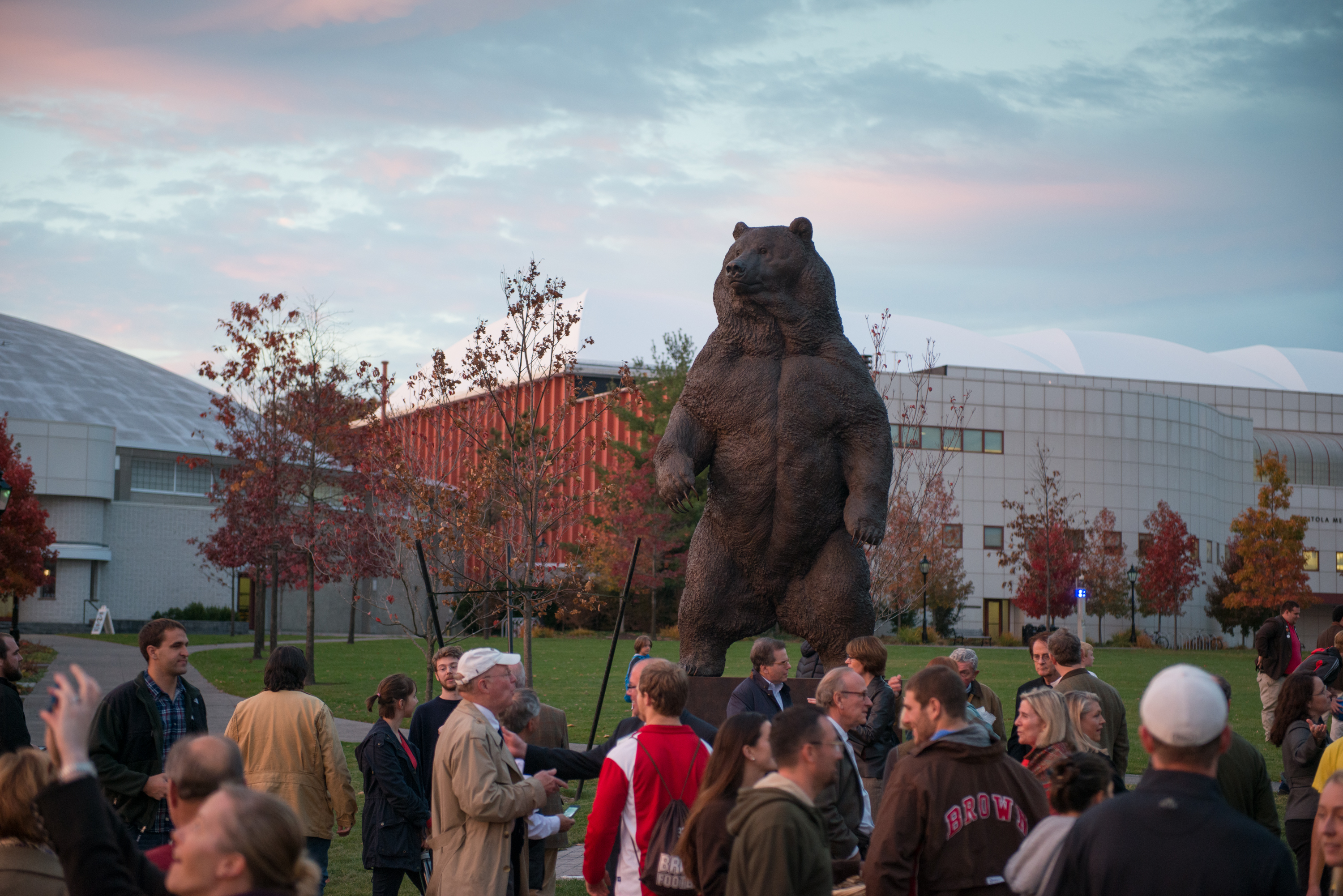 On Homecoming Weekend, 2013, the athletic mascot symbol void created when Bronze Bruno migrated to the College Green in 1992 was finally filled. The November 2 dedication of Indomitable, the massive ten-foot- four inch Kodiak bear which stands near the Ittleson Quadrangle and Nelson Fitness Center signaled a new era in Brown athletics. The statue presents a powerful focal point at the entrance to the Erickson Athletic Complex. At the ceremony, sculptor Nick Bibby described his creation as “a tremendous specimen that represents magnificent strength and fearlessness.” A compendium of costumed Brunos over the decades is highlighted by President Christina Paxson and Bruno. The contemporary mascot is Brown’s ambassador at a wide range of athletic and community events.