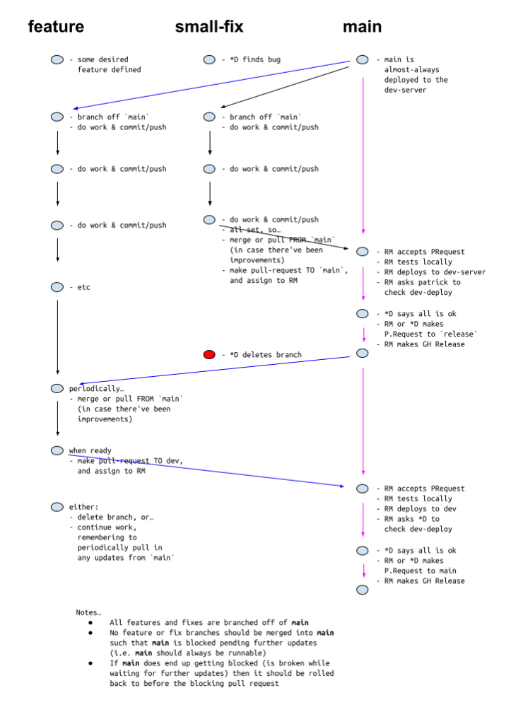 The RMs are responsible for maintaining the main branch and for deploying and tagging releases. The approximate time of deployment is visible as the merge commit in the version control system.