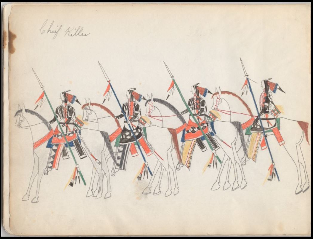 Four Cheyenne Horsemen by Chief Killer. 14th of 16 original pencil sketches in ledger book. Ledger drawing, 1877. Digital Repository.