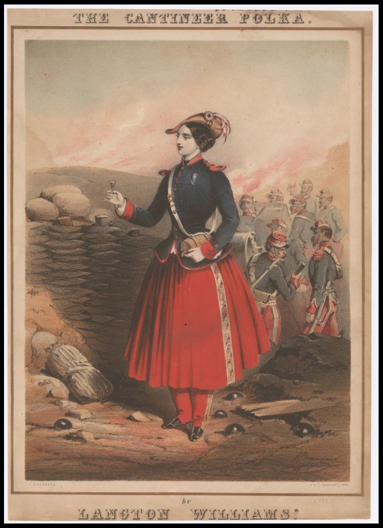 The Cantineer Polka by Langton Williams. Cantinière standing by gabions near battlefield holding cup, soldiers behind manning guns. Lithograph, 1855. Digital Repository.