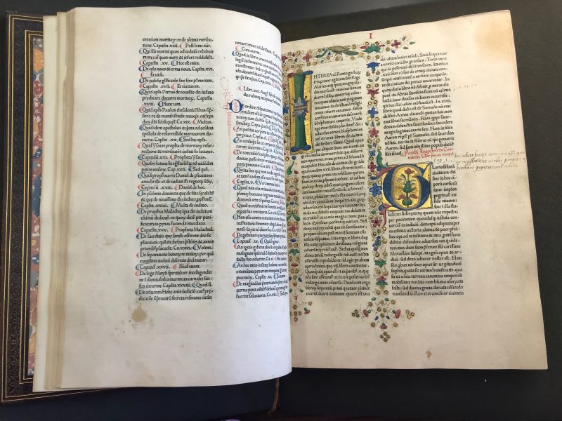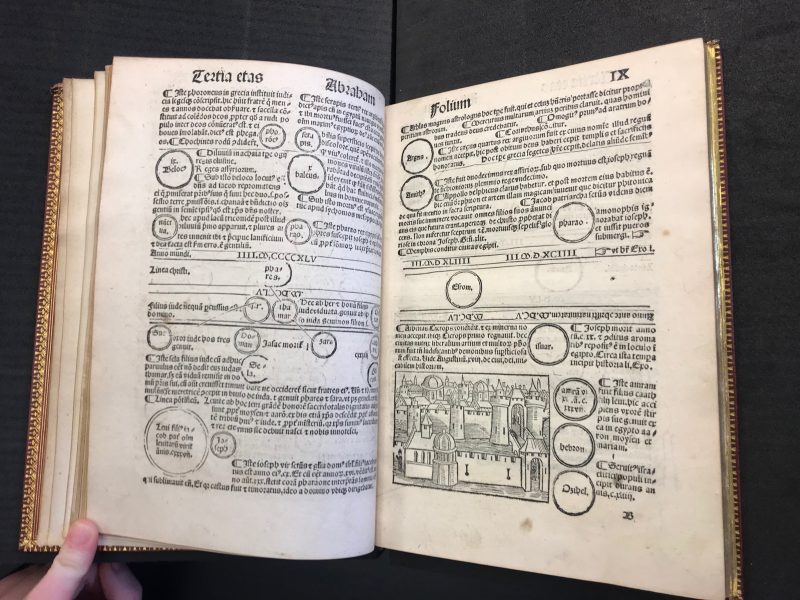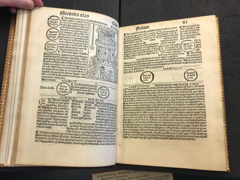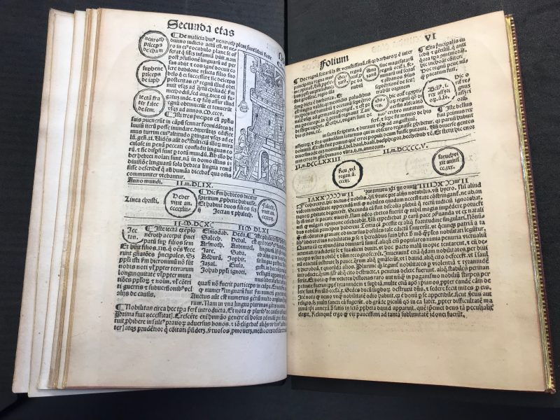 Additionally, the Hay holds the early Christian theologian and philosopher Augustine of Hippo’s City of God, signed and dated by Bernardo Bembo, a political figure in Italy. The collection includes incunabula printed by Gutenberg and another printed by Peter Schoerfer. Finally, the Hay owns a near-perfect volume of the Nuremberg Chronicle, which was the last major text recounting world history printed in 1493, before knowledge of the Americas.