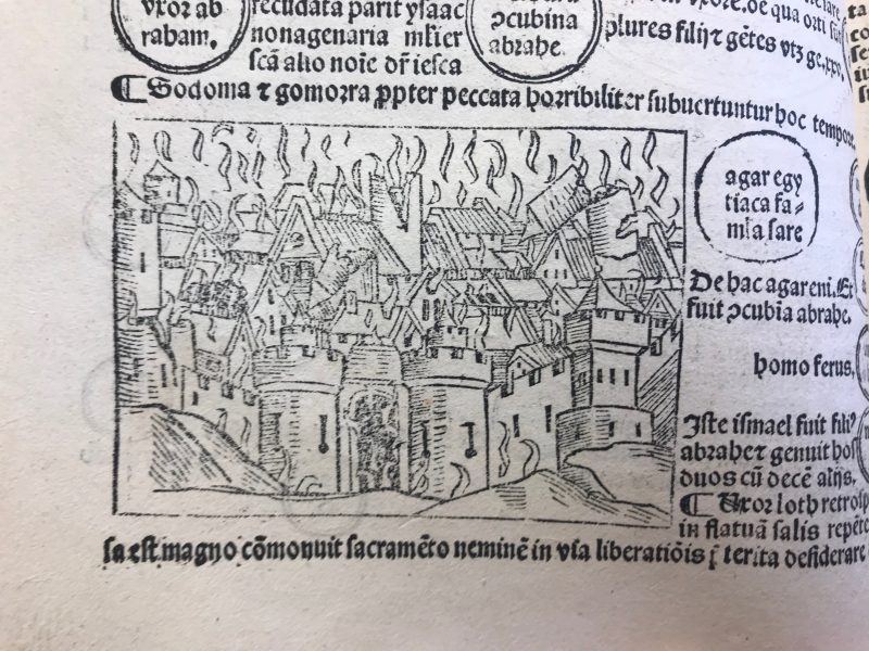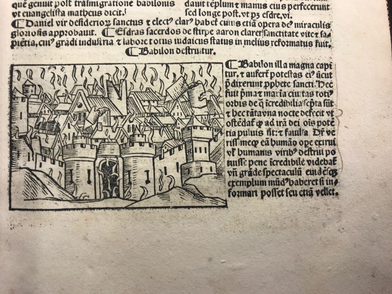 Of note are the Fasciculus Temporum, a volume of ecclesiastical and world history, of which the Hay owns 25 of the 33 editions printed. Fasciculus Temporum was first printed in Cologne in 1474. The edition above was printed in Lyon, France by Matthias Huss in about 1495 and includes additional matter regarding the brokered peace between Pope Alexander and Charles VIII, as well as the return of Charles to France. Of note in the above photos is the repeated use of a the same woodcut to depict the biblical fires of Babylon and Sodom and Gomorra.