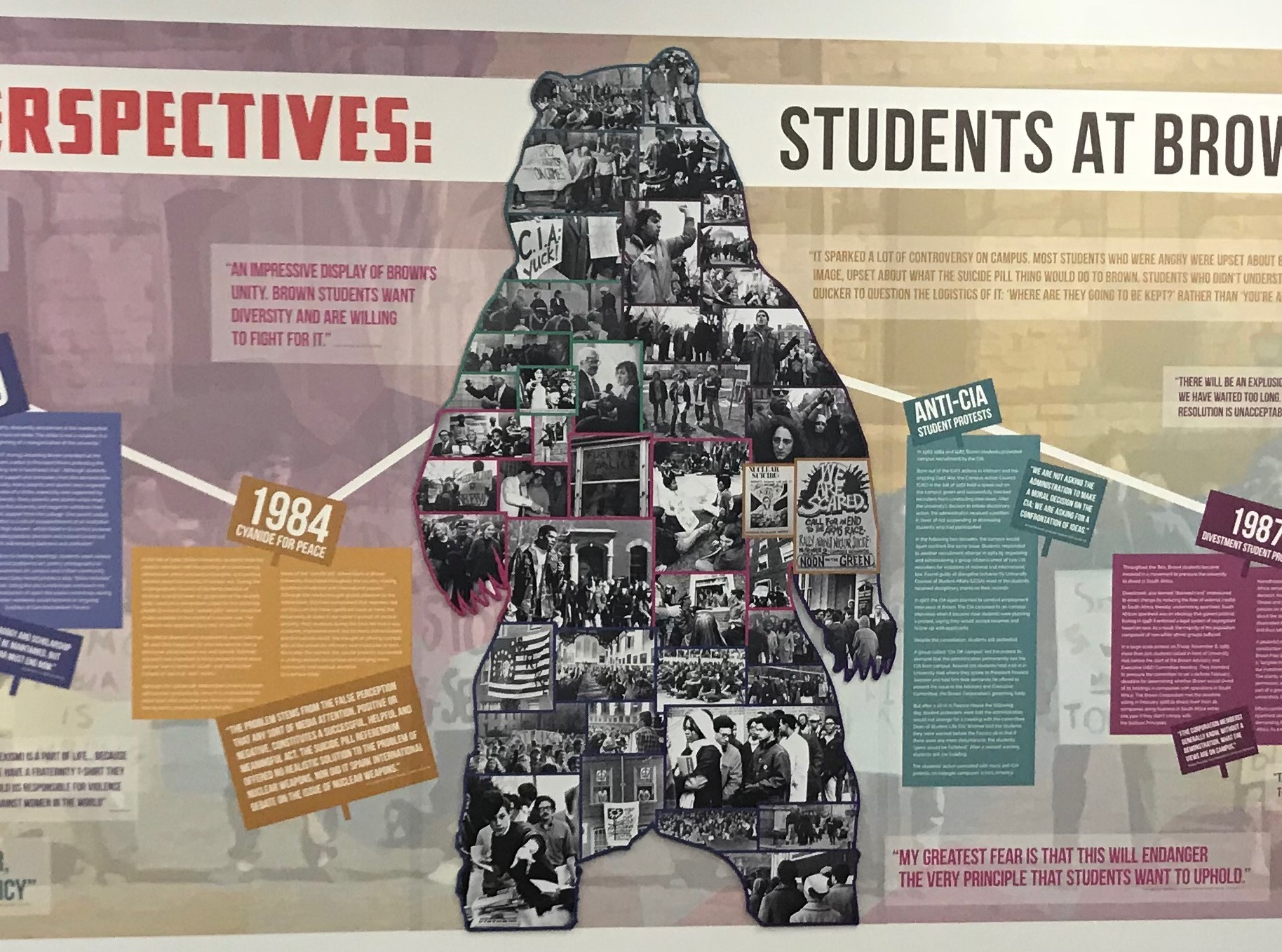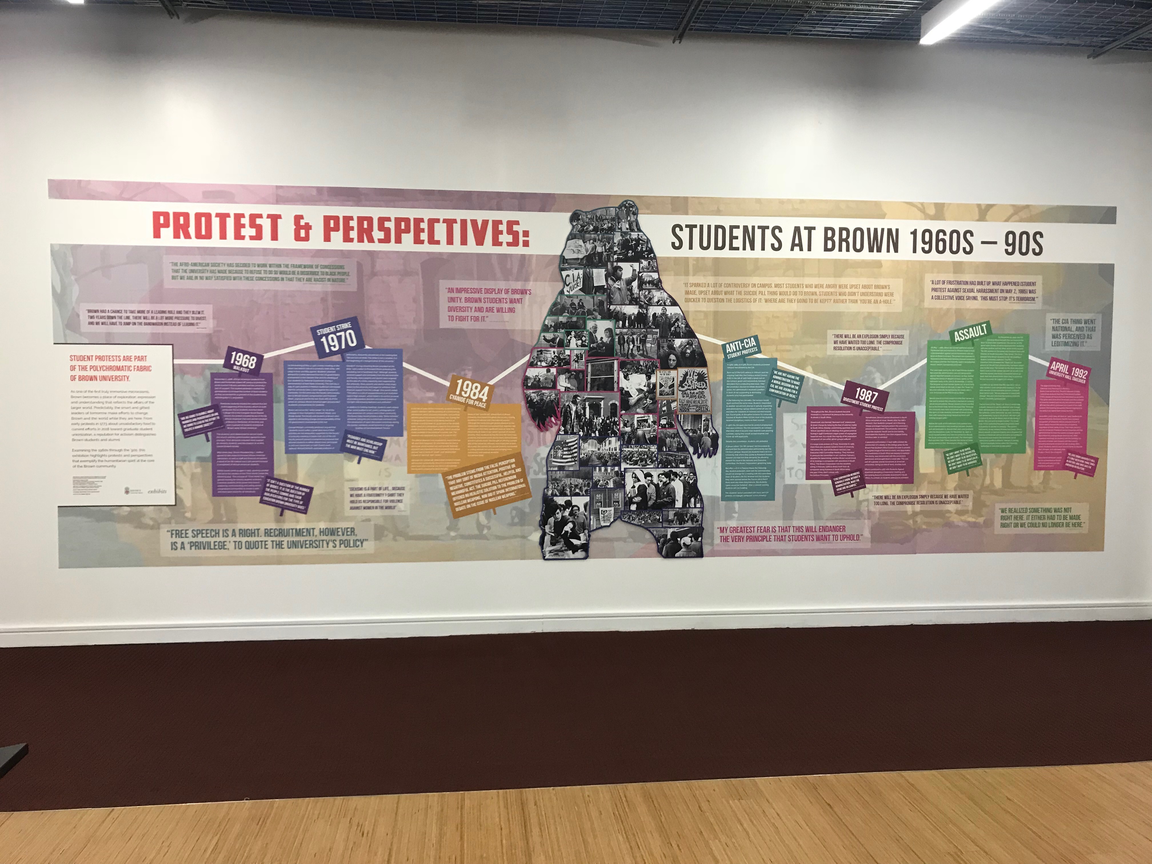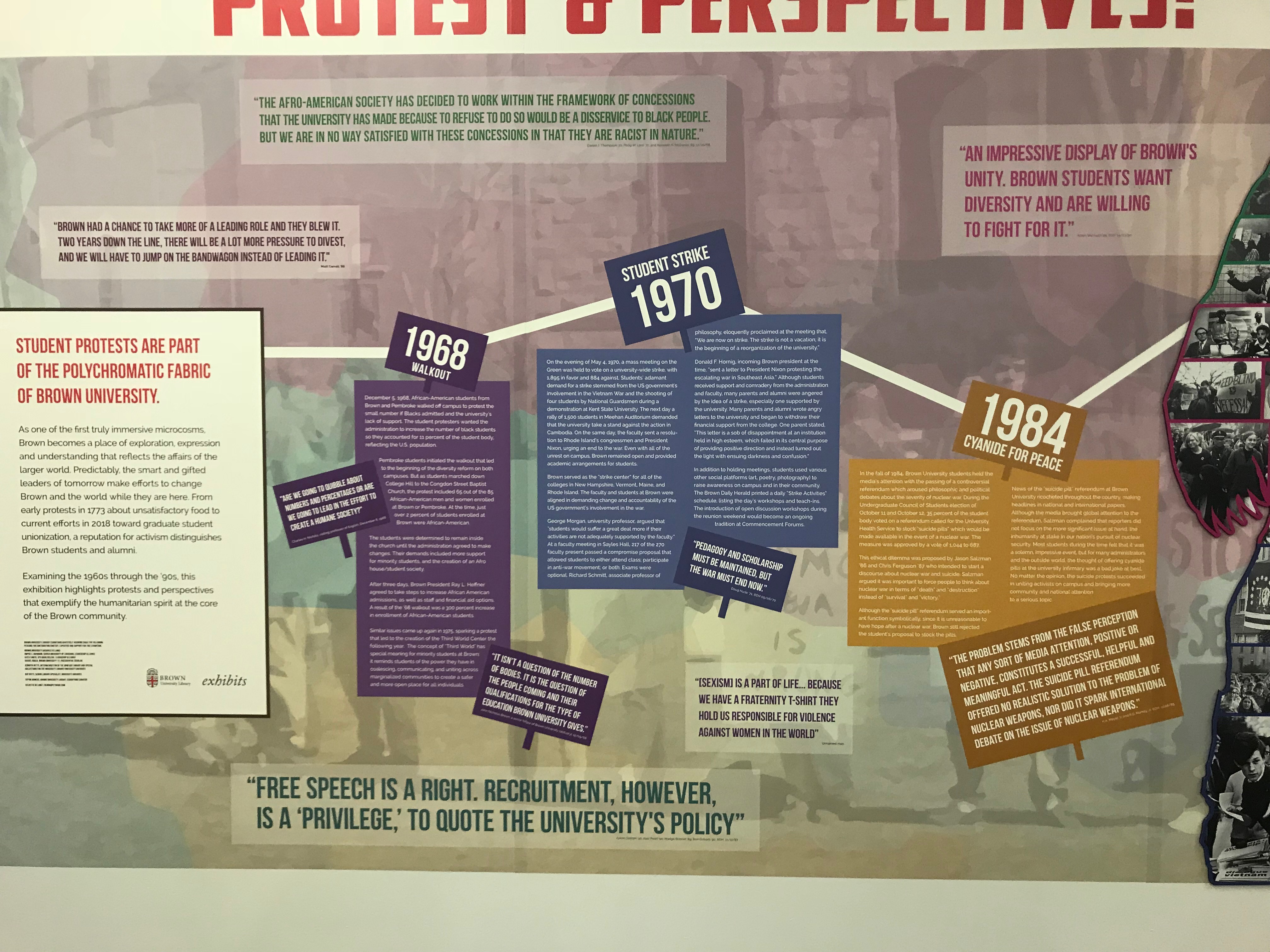 Exhibition “Protest & Perspectives: Students at Brown 1960s-90s” on display in the Sidney E. Frank Digital Studio in the Rockefeller Library.