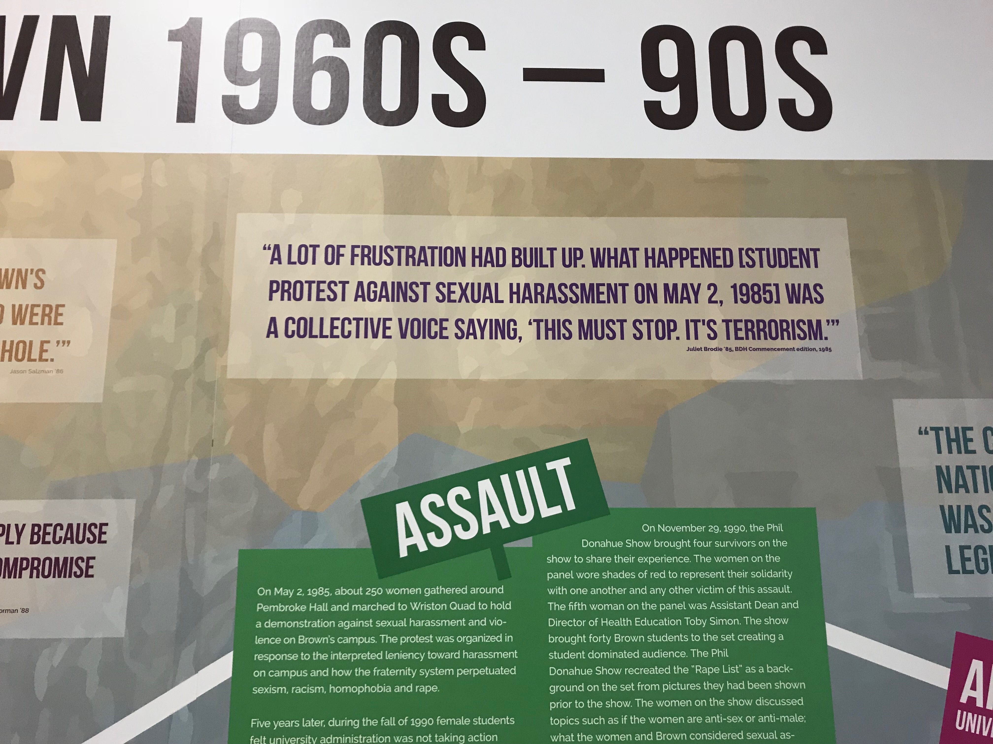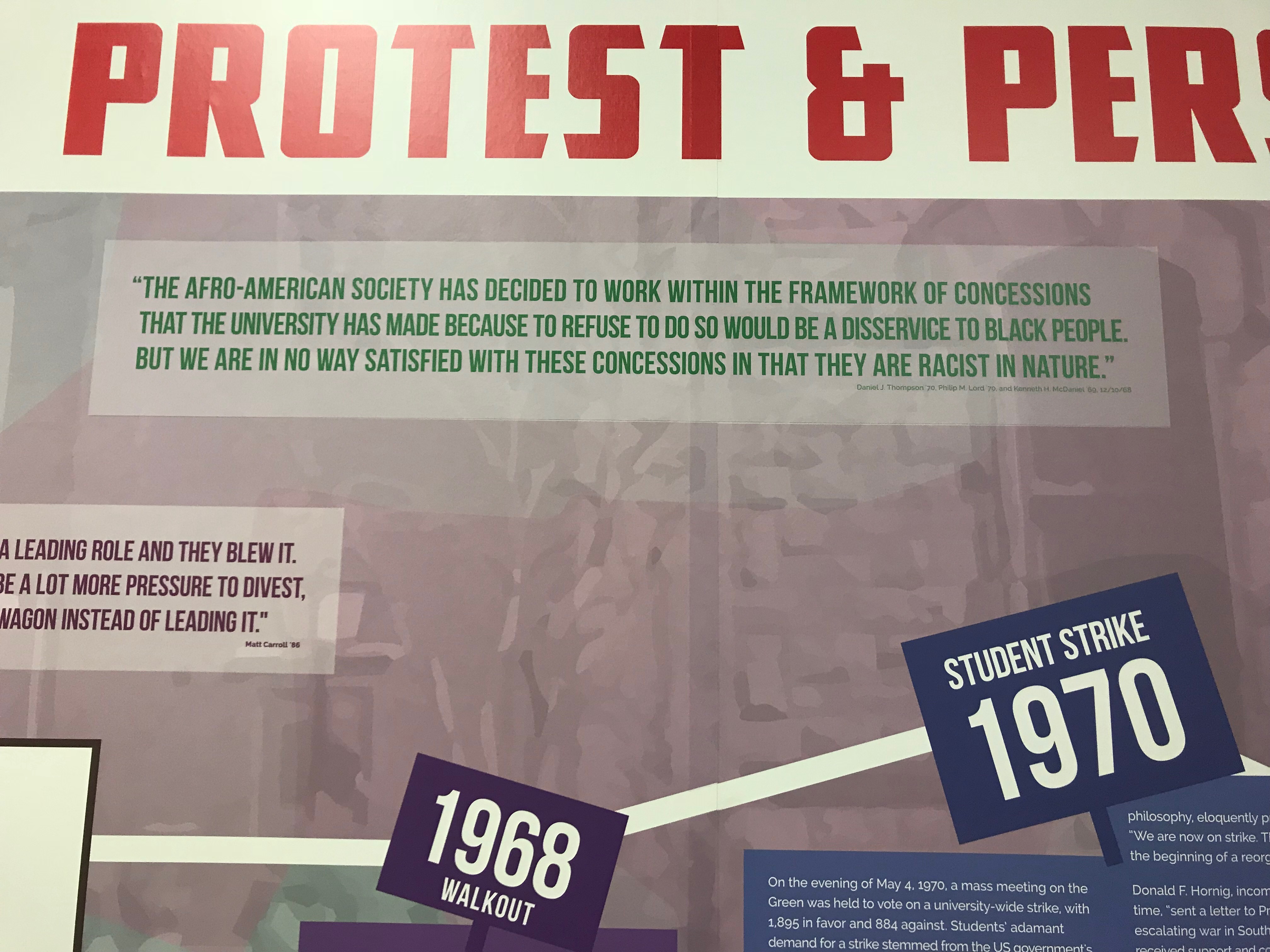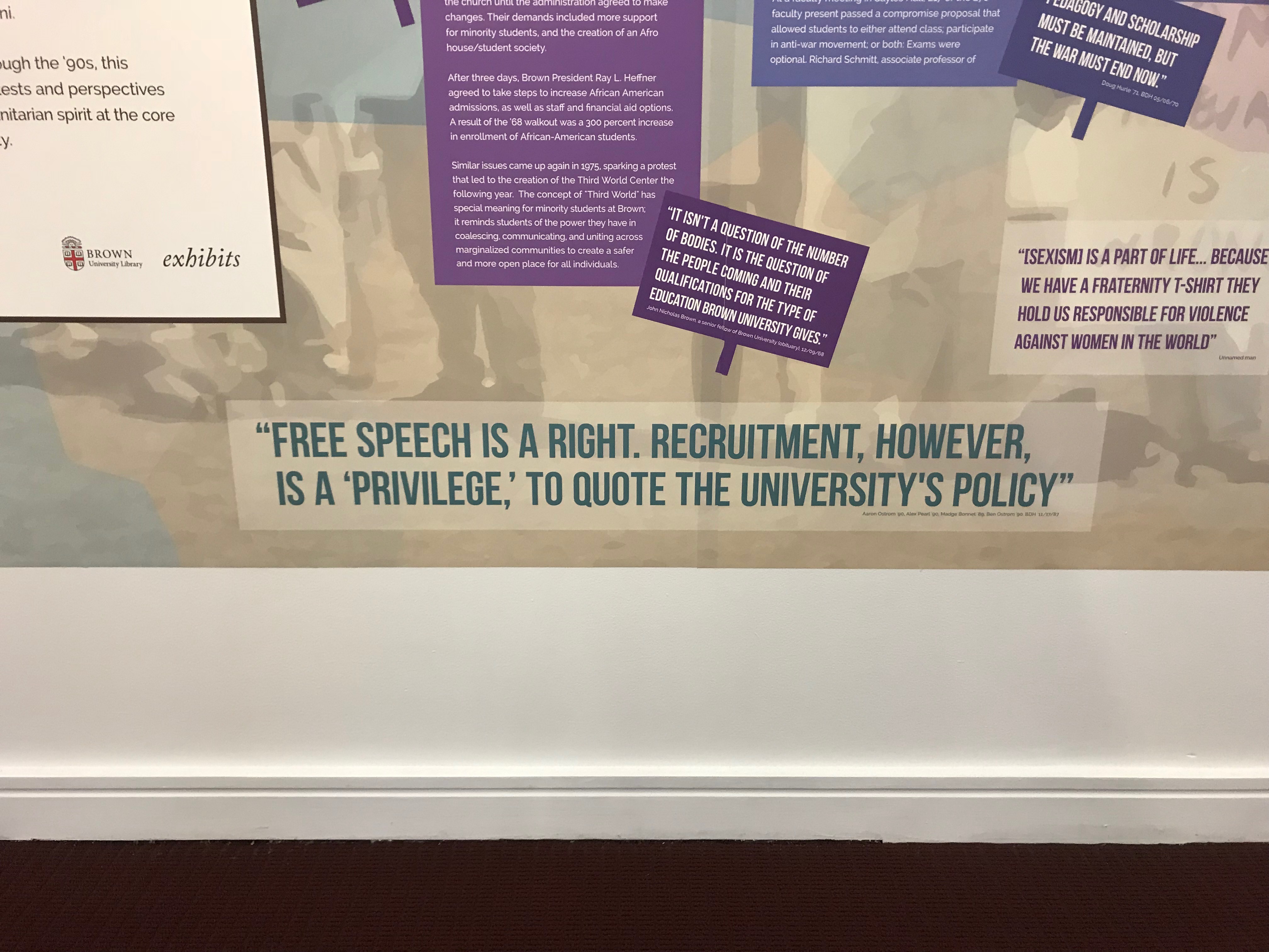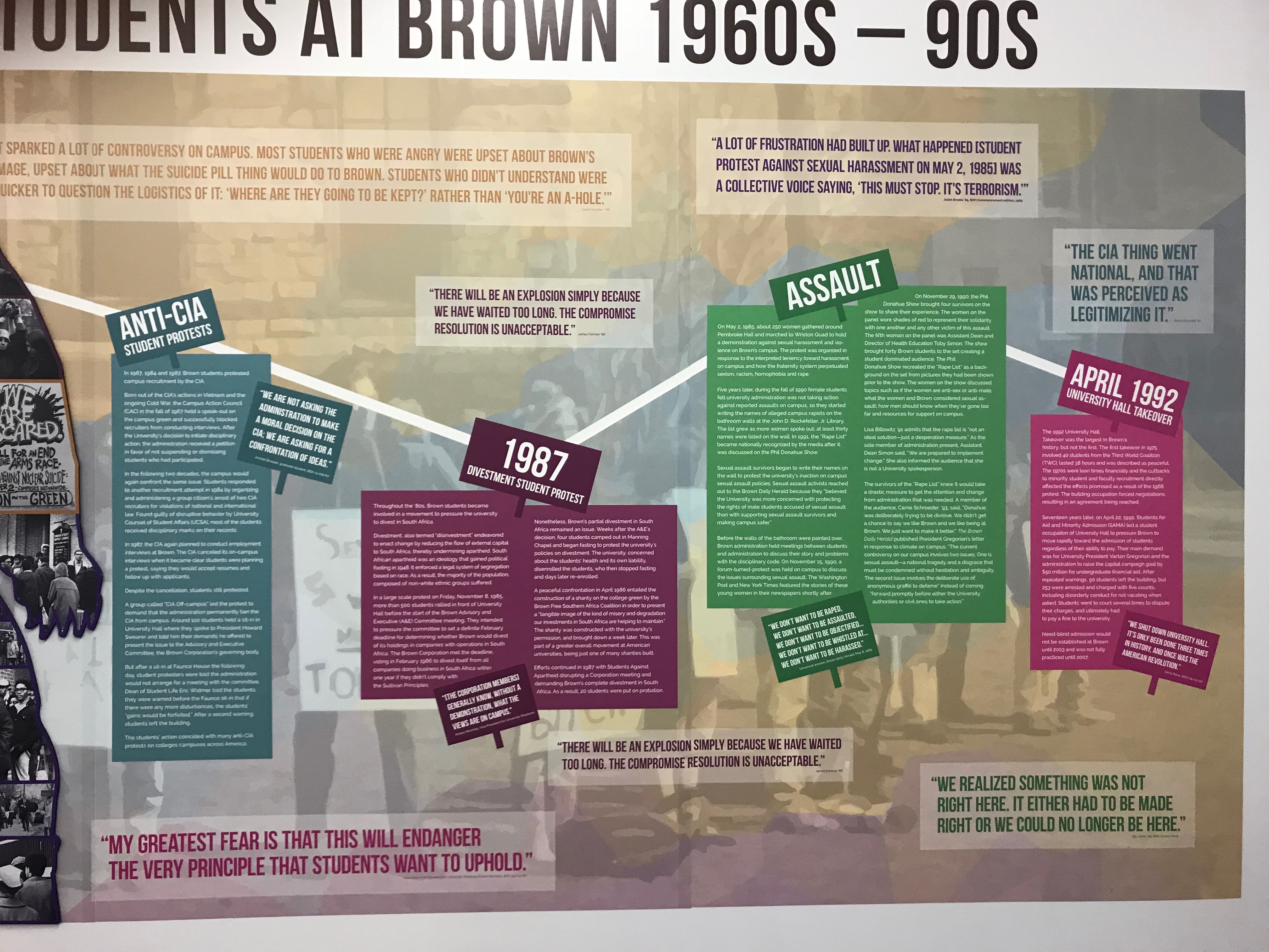 Exhibition “Protest & Perspectives: Students at Brown 1960s-90s” on display in the Sidney E. Frank Digital Studio in the Rockefeller Library.
