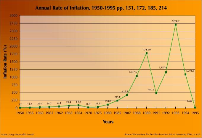 A careful look at this graph shows the story of the Brazilian economy’s inflation. The graph shows inflation rising steadily through the second half of the twentieth century, spiking in 1989 and 1993. The slow rise of inflation had many causes, much can be attributed to a series of presidents who ignored or worsened the country’s economy. The spikes in the late 1980s and early 1990s correlate with José Sarney’s presidency and the Cruzado Plan in 1988 and 1989, followed by continuing economic hardship and instability for several years until there was a sharp drop in inflation due to Fernando Henrique Cardoso’s Plano Real.