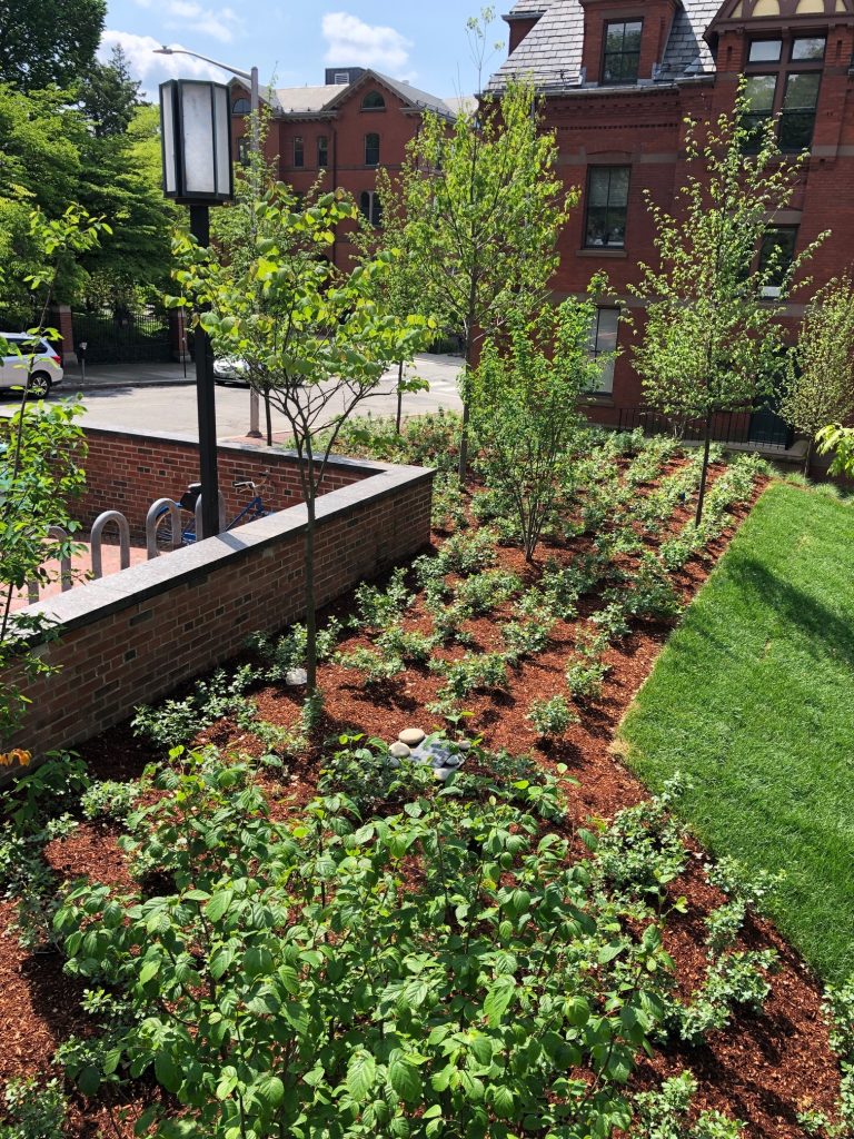 The University generously updated the landscaping in this area during Spring 2019, improving the grade of the space and planting trees, shrubs, and ground cover.