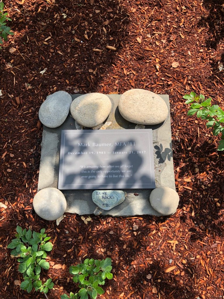Included in the new design is the Eastern redbud tree and plaque in memory of former Library staff member Mark Baumer, MFA’11. Mark was struck and killed by a car in January 2017 while walking across country to raise awareness around fossil fuels. A group of Library staff members worked with Brown Facilities Management to relocate the tree and plaque to its current spot in the newly landscaped area, surrounded by the new plantings.
