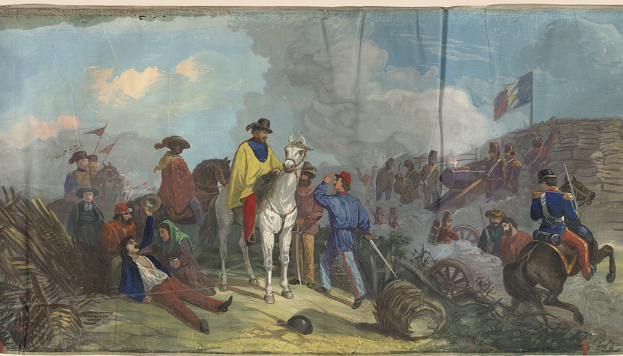 Garibaldi sits upon his horse wearing a broad-brimmed hat with an ostrich feather in it and an American poncho; his servant who came with him from America rides behind him. Story, J. J. (Nottingham: 1860). 1 scene; 147.5 x 258.6 cm. reformatted digital.
