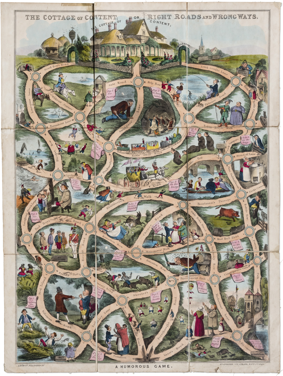 Despite its moral message, The Cottage of Content achieves its aims through humor. Notice “Blanket Row,” in which a group playfully tosses a man in the air, or “Frog Island,” where dancing frogs wear formal dress. Players advance along curving roads and encounter rewards and forfeits along the way, including “Pay 2 for folly” or “Take 2 for being charitable.”