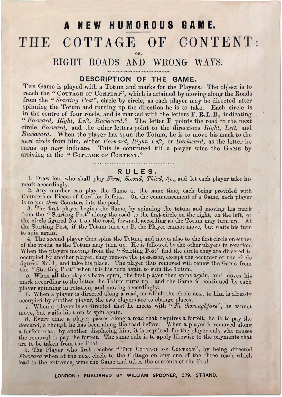 Despite its moral message, The Cottage of Content achieves its aims through humor. Notice “Blanket Row,” in which a group playfully tosses a man in the air, or “Frog Island,” where dancing frogs wear formal dress. Players advance along curving roads and encounter rewards and forfeits along the way, including “Pay 2 for folly” or “Take 2 for being charitable.”