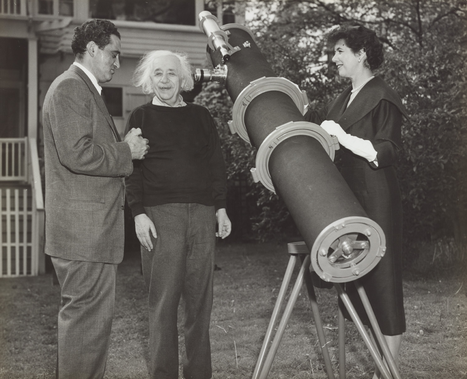 Martha Sharp, Albert Einstein, and Children to Palestine donor examining a donated telescope