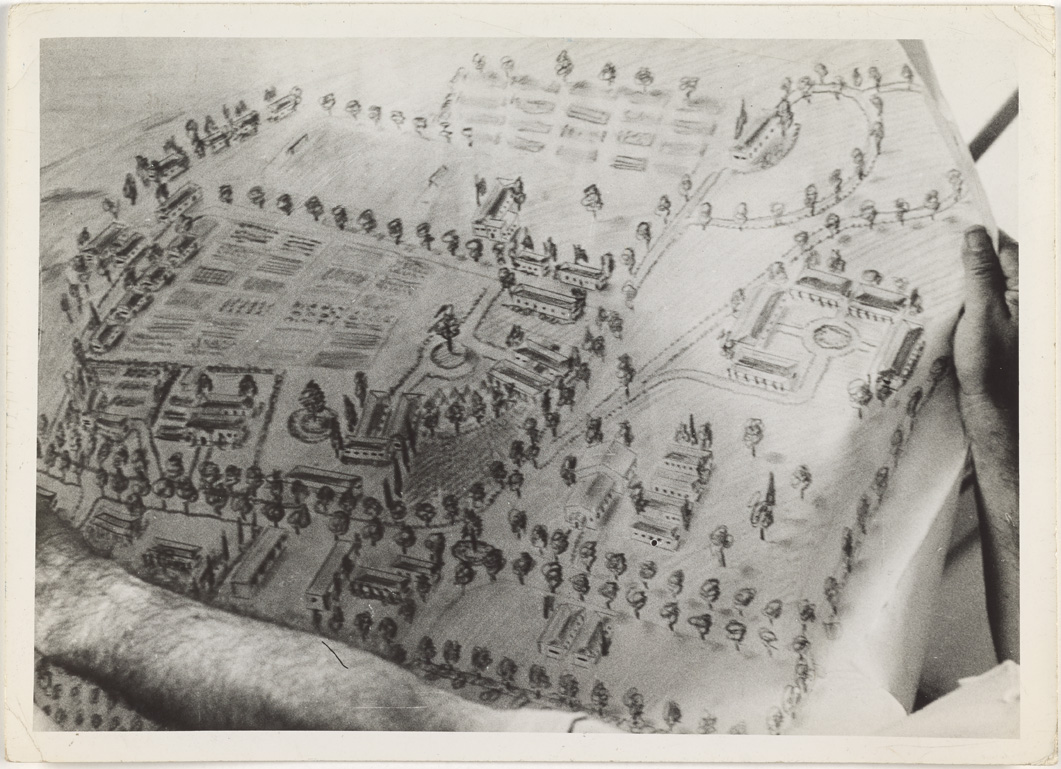 Dr. Siegfried Lehmann holding plan of the future Ben Shemen at Kfar Vitkin