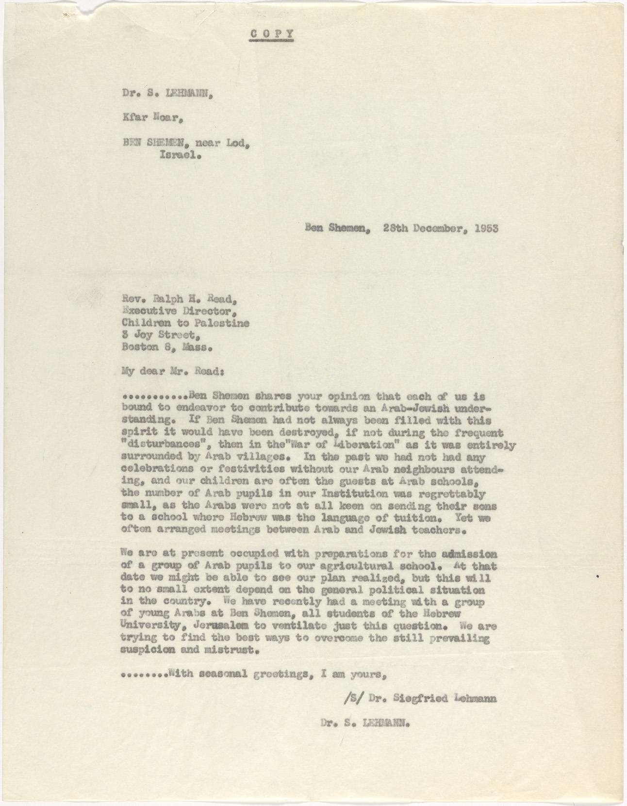 Dr. Siegfried Lehmann to Rev. Ralph H. Read, Executive Director of Children to Palestine