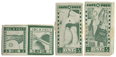 Fluxus artist Robert Watts created several series of ?artistamps? to comment on politics, authority, and popular culture. His works are the earliest known stamps to be printed as art pieces, and feature mashups of art masterpieces, postcard imagery, advertisements, and popular portraiture. ?Safe Post? and ?Jockpost? stamps were made available as sheets and in stamp-dispensing machines in exhibit spaces.