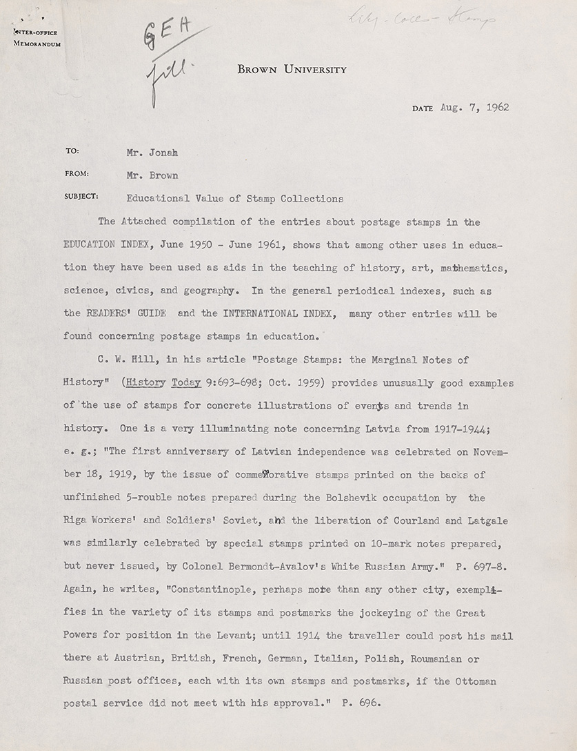 Many universities had stamp collections in the mid-twentieth century, but only a few do today. In this memorandum to University Librarian David A. Jonah, the author explains the significance of the hobby and collections for educational and research purposes. He argued that stamps can be used to teach history, art, mathematics, science, civics, and geography.