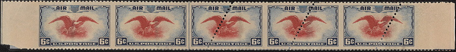 Misperforations on strip of 6¢ Eagle Air Mail Issue, 1938