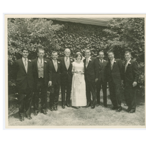 Michael Carley and Connie Worthington wedding group, reception at the Brown Faculty club. June 6th, 1964.