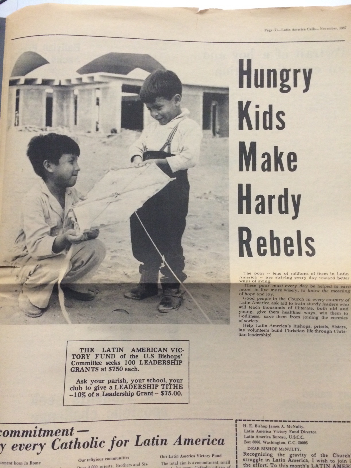 Latin America Calls! was a Catholic publication that encouraged Americans to “go to Latin America; help others go,” in an attempt to prevent the spread of communist influence in poor rural regions. Organized by Cardinal Cushing of Boston in 1963, the magazine was open about its political leanings, declaring in giant ads published in each issue that “Hungry Kids Make Hardy Communists.” See early examples of the newsletter here.