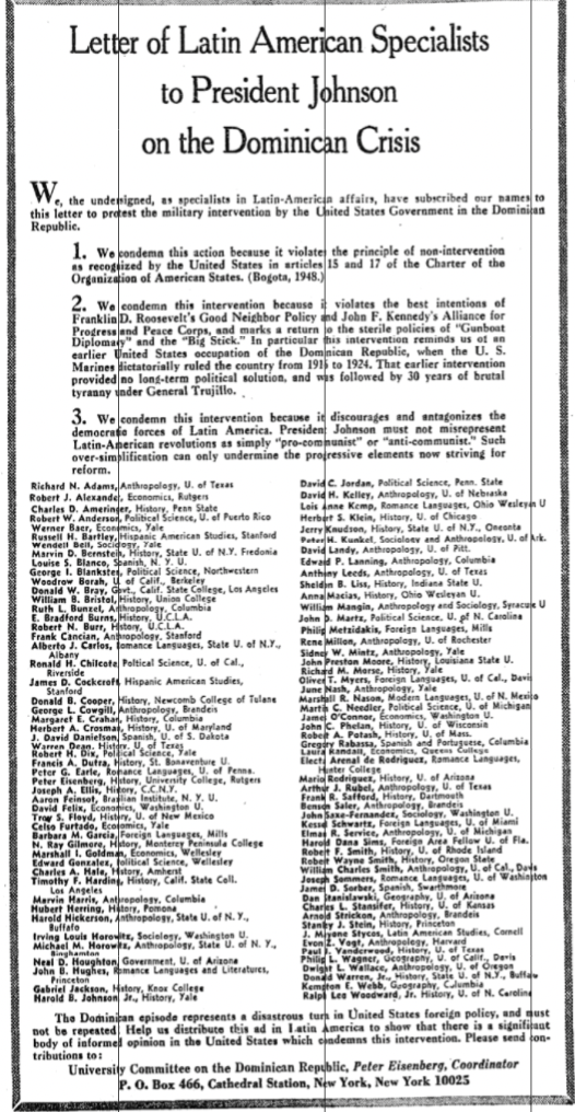 On April 28, 1965, the United States invaded the Dominican Republic to prevent another Cuba. Public opinion remained in favor of the invasion, but scholars, missionaries, and volunteers who had been stationed in Latin America opposed Johnson’s policies. Click here to read a statement by specialists to President Johnson about the Dominican Republic. Brady Tyson, a Methodist missionary, was someone who was deeply affected by the invasion of the Dominican Republic.