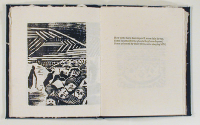 ; fine handmade paper, letterpress, woodcuts; signature stitched into cloth covered board.