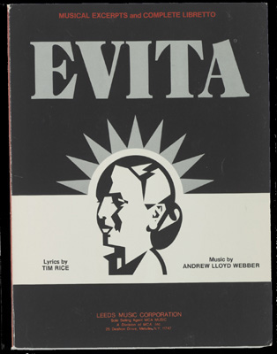 Evita Lloyd Webber, Andrew. Evita: musical excerpts and complete libretto. Lyrics by Tim Rice. Melville, N. Y.: Leeds Music Corp., [c1979] Harris Collection of American Poetry and Plays Ken Bloom (author of American Song) on Evita: "Sound and fury". The best-remembered song is Don't Cry for Me, Argentina. |