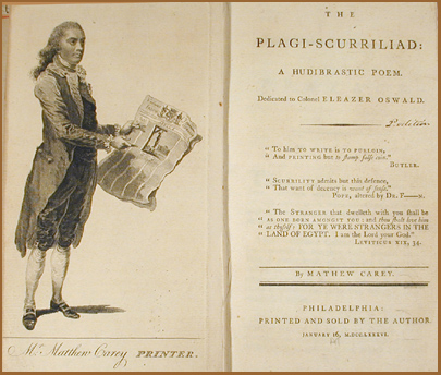 ![]() | *Carey, Mathew. The Plagi-scurriliad: a Hudibrastic poem : Dedicated to Colonel Eleazer Oswald. by Mathew Carey. Second edition. Philadelphia : Printed and sold by the author, 1786. Bookplate of Henry B. Anthony. Harris Index no. 566 Harris Collection of American Poetry and Plays |