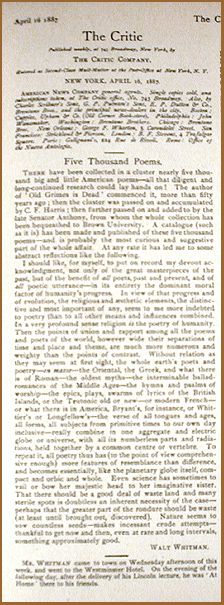 ![]() | *Whitman Walt. "Five thousand poems." The Critic, April 18, 1887. Harris Collection of American Poetry and Plays |