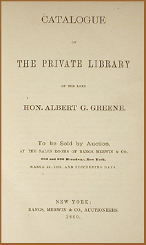 *Bangs & Co. Catalogue of the private library of the late Hon. Albert G. Greene. : To be sold by auction, at the Sales Rooms of Bangs, Merwin & Co., 694 and 696 Broadway, New York, March 29, 1869, and succeeding days. New York : Bangs, Merwin & Co., auctioneers, 1869. Harris Collection of American Poetry and Plays | ![]() |