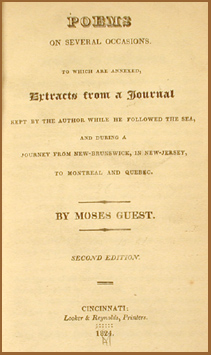 Guest, Moses. Poems on several occasions. : To which are annexed, Extracts from a journal kept by the author while he followed the sea, and during a journey from New-Brunswick, in New-Jersey, to Montreal and Quebec. Second edition. Cincinnati: : Looker & Reynolds, Printers, 1824. Bookplate of Henry B. Anthony. Harris Index no. 1514. Harris Collection of American Poetry and Plays | ![]() |