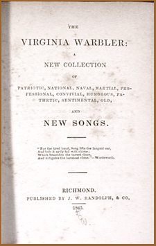 *The Virginia warbler : a new collection of patriotic, national, naval, martial, professional, convivial, humourous, pathetic, sentimental, old, and new songs. Richmond : J.W. Randolph & Co., 1845. Bookplate of Henry B. Anthony. Harris Index no. 3192. Harris Collection of American Poetry and Plays | ![]() |