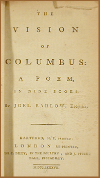 *Barlow, Joel. The vision of Columbus; a poem in nine books. By Joel Barlow, esquire. Hartford: Printed by Hudson and Goodwin, for the author, 1787. Harris Collection of American Poetry and Plays | ![]() |