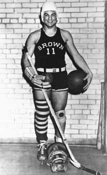 ![]() Don Whiston, Class of 1951, was outfitted with a face mask designed by Dr. G. Edward Crane, a former Brown hockey player in the Class of 1931, after Whiston was hit in the mouth by a puck. Whiston coached the Brown team from 1952 to 1955, and was a goalie on the 1952 Olympic team. |