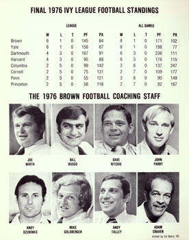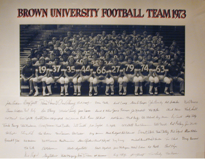 ![]() The 1973 football team, John Anderson's first, signed the team photograph which was traditionally presented to Fred Broomhead '05, who hosted a seasonal dinner for Brown athletes at Carr's Restaurant. |